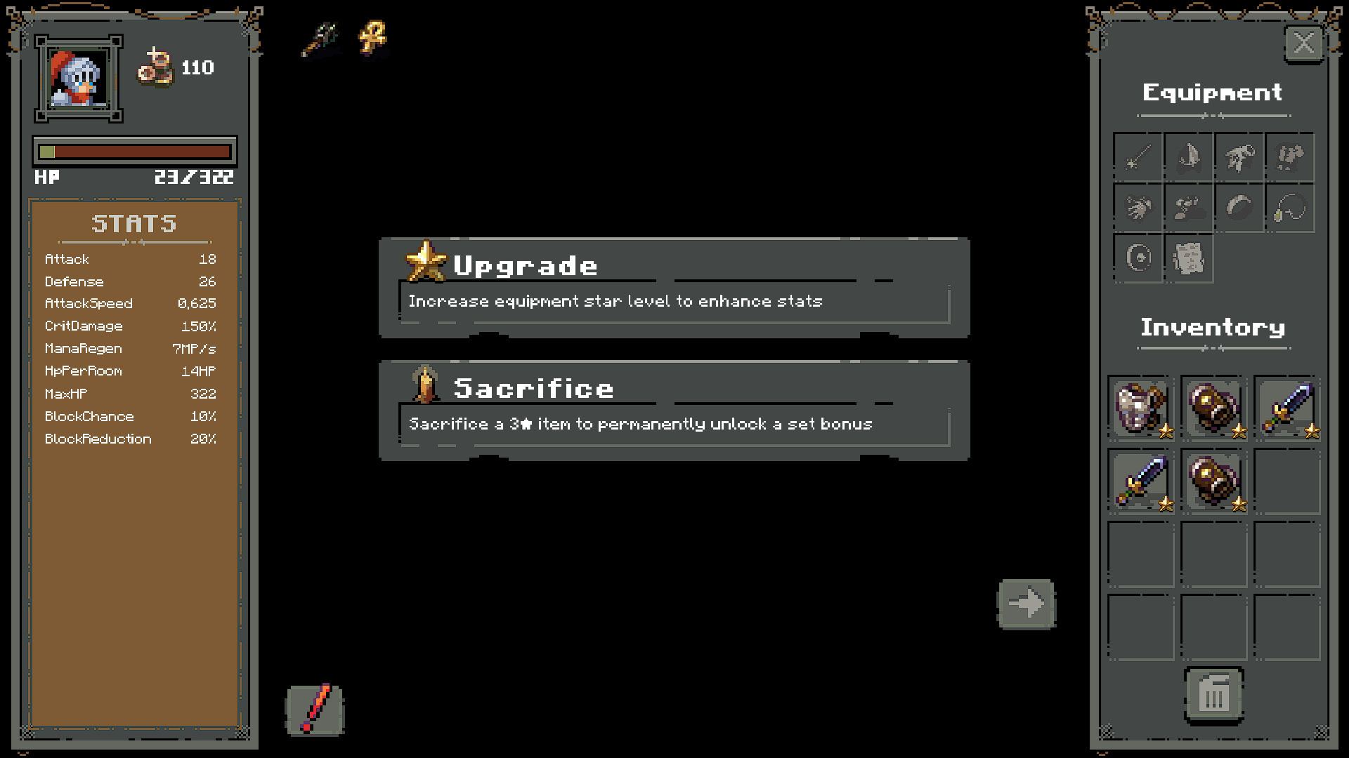 - Collect & Combine: Gather equipment and merge duplicates to create stronger versions (up to 3 stars).